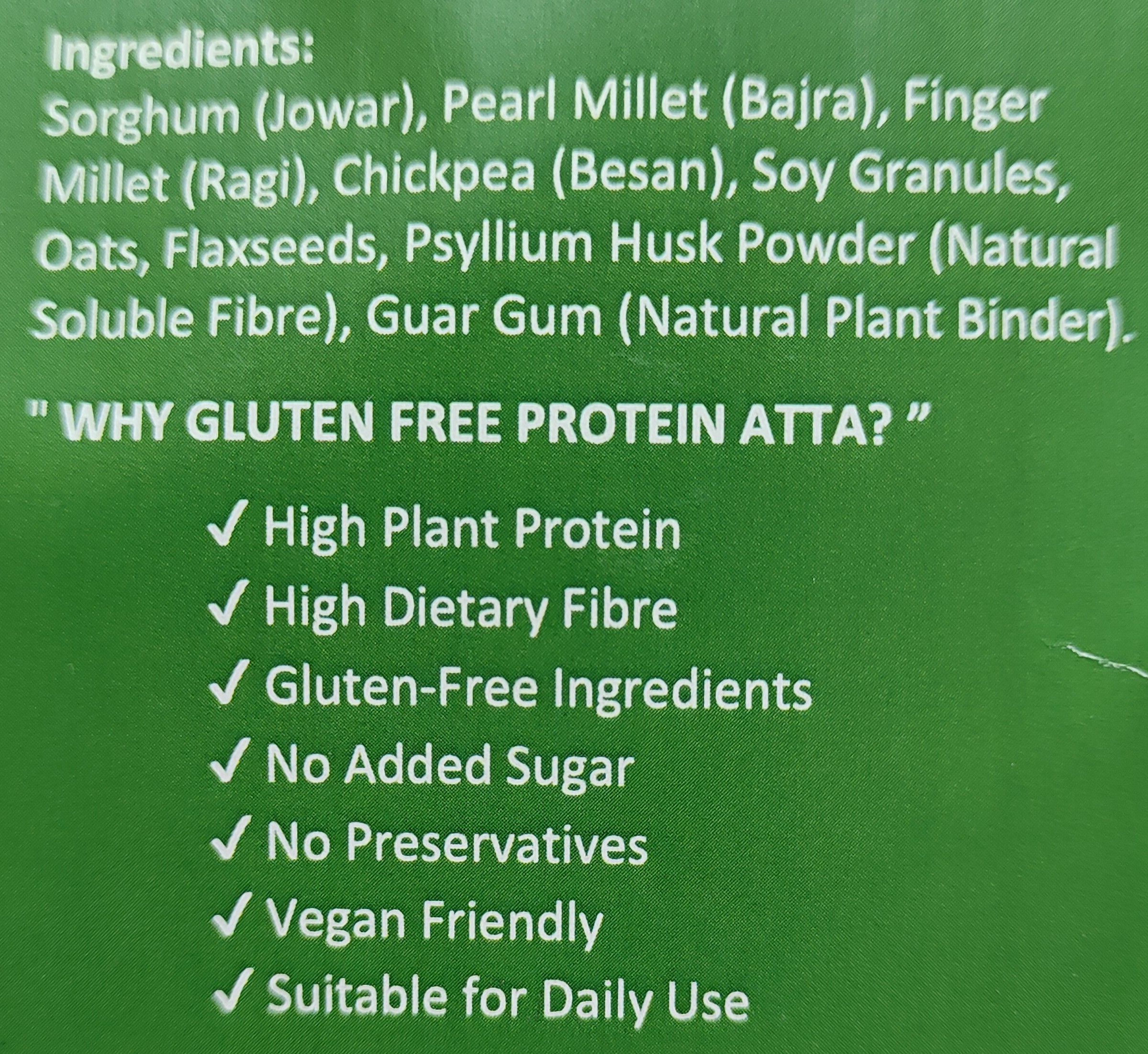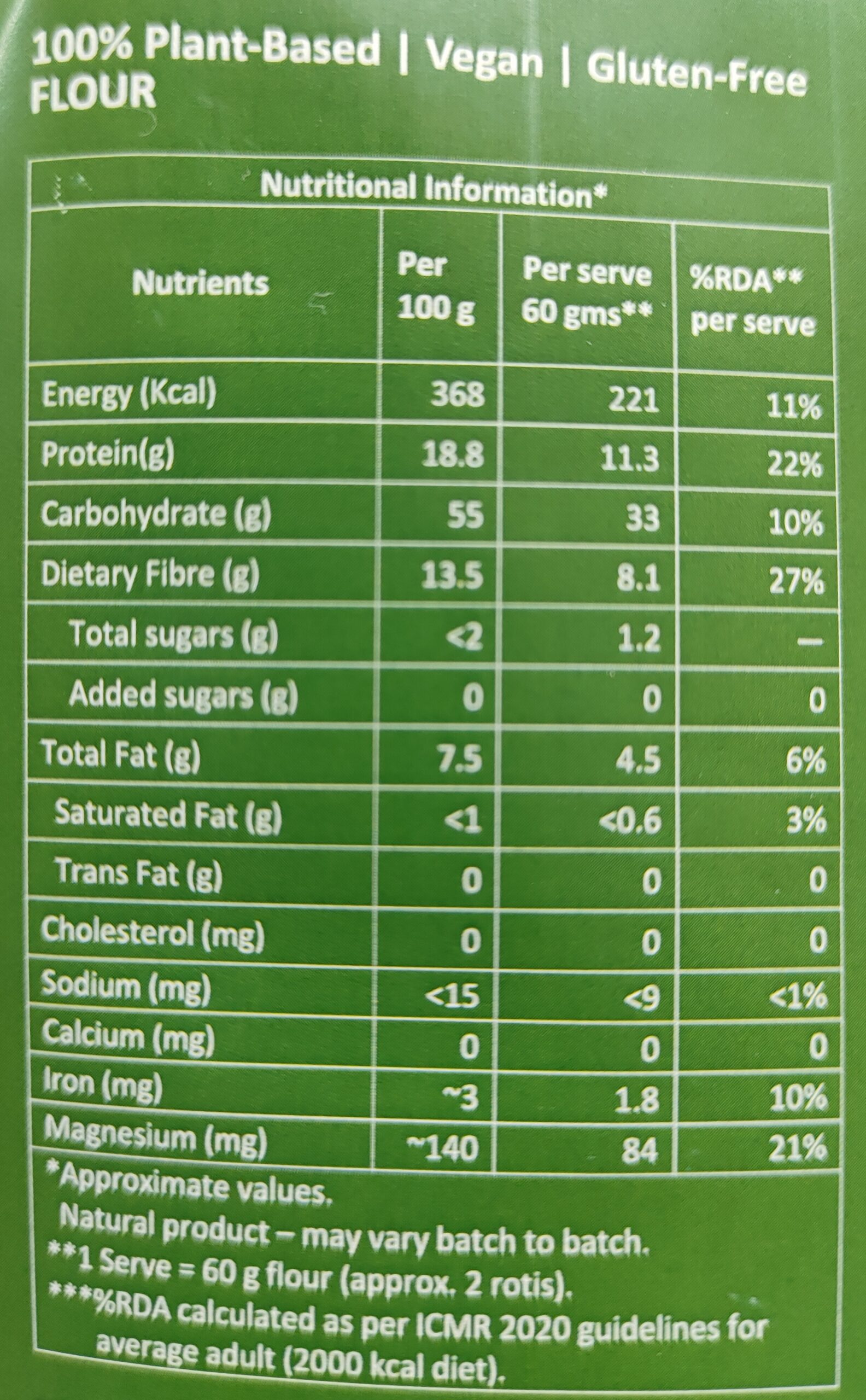 100% Gluten-free Atta with Approx 19 g  Protein and Rich in Fibre yet easy to digest and perfect for a healthy lifestyle.